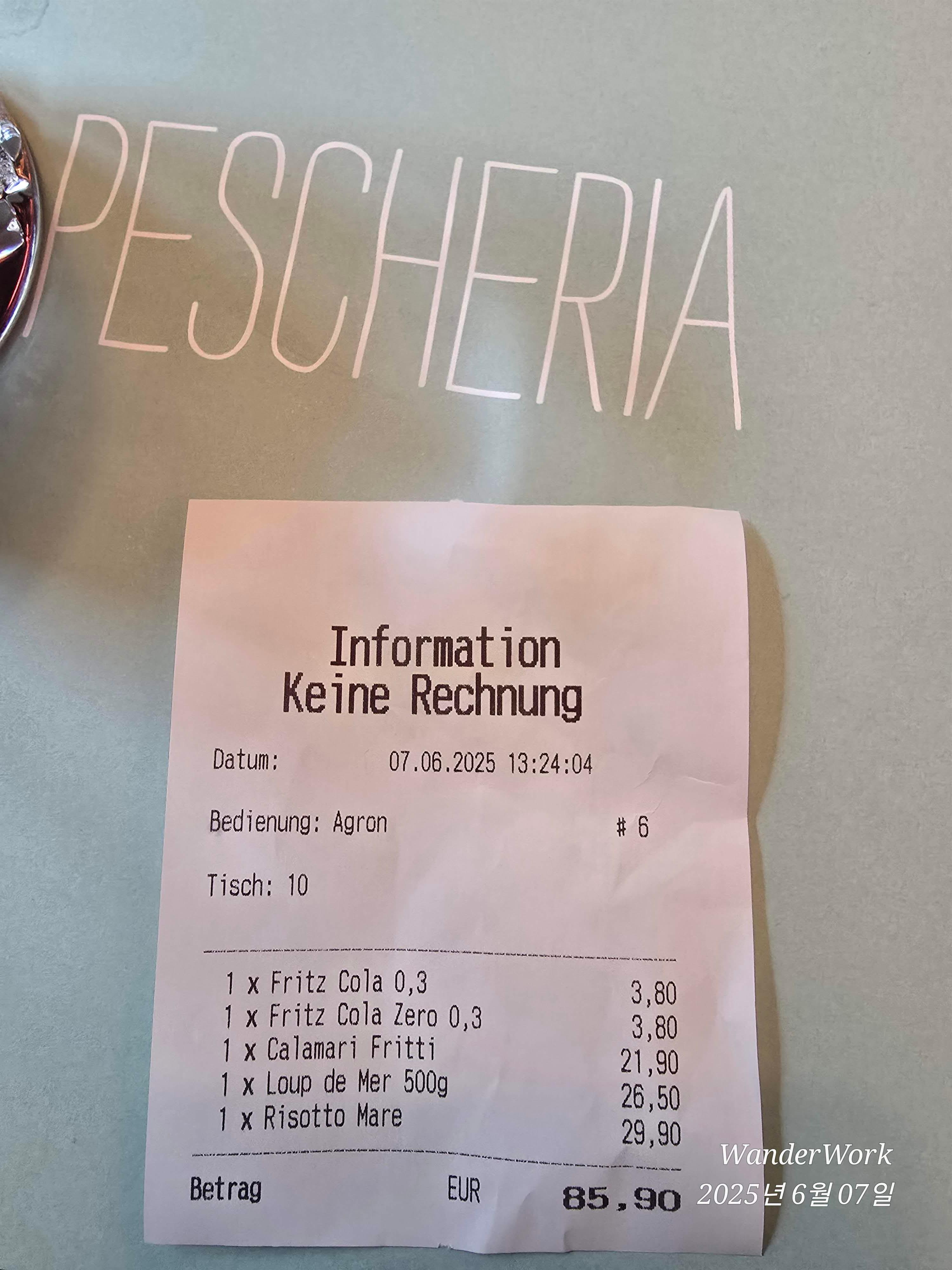 (2인 3메뉴, 콜라 2잔 총 85.90유로)